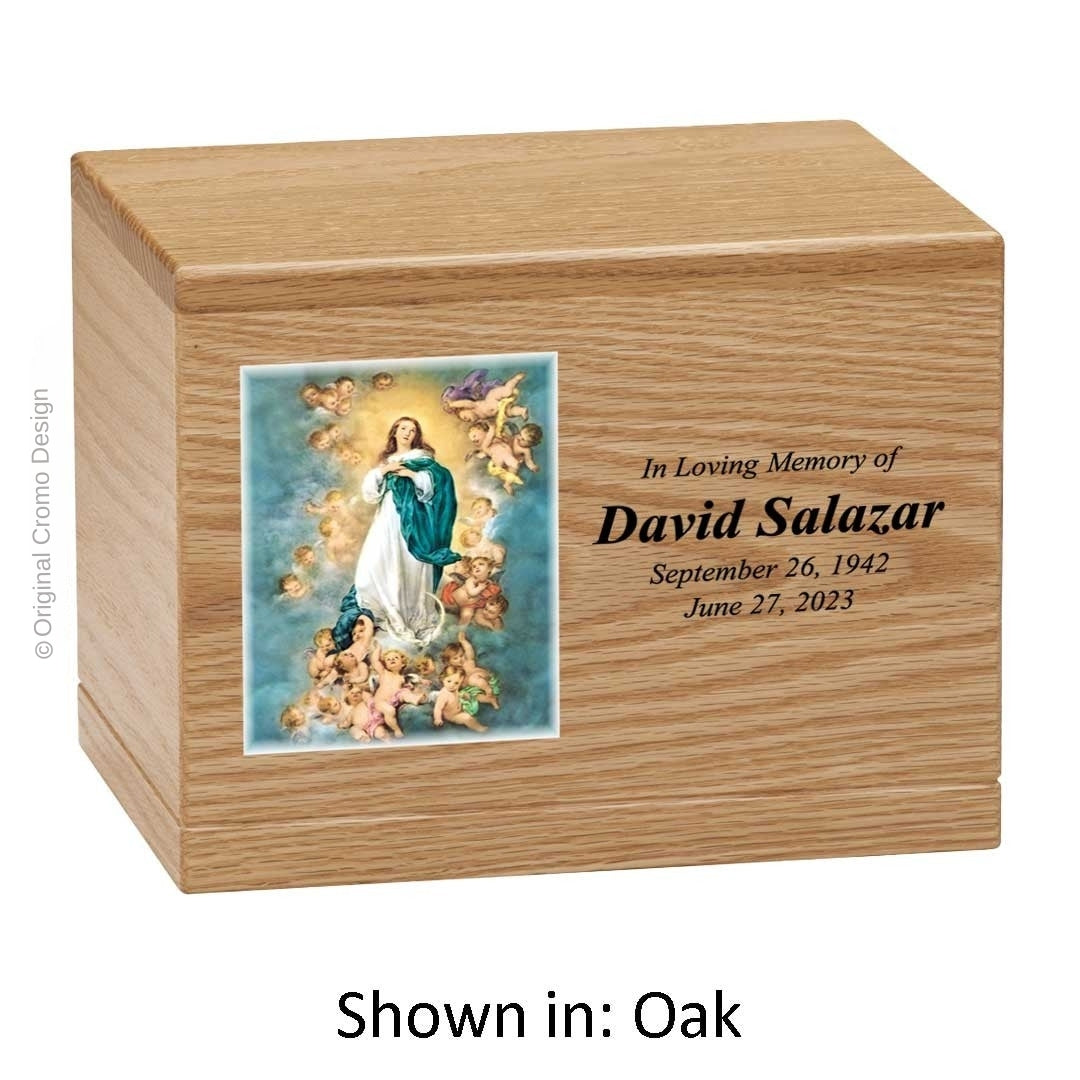 Individually handcrafted from Oak wood with a rich, warm finish, these urns emphasize the natural beauty of the wood while enhancing the texture of the raised image. This unique design creates a truly one-of-a-kind memorial.