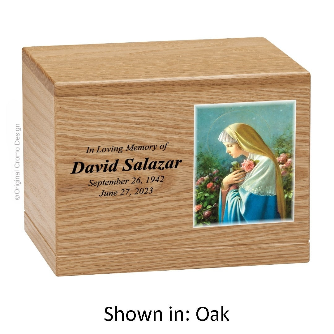 Individually handcrafted from Oak wood with a rich, warm finish, these urns emphasize the natural beauty of the wood while enhancing the texture of the raised image. This unique design creates a truly one-of-a-kind memorial.