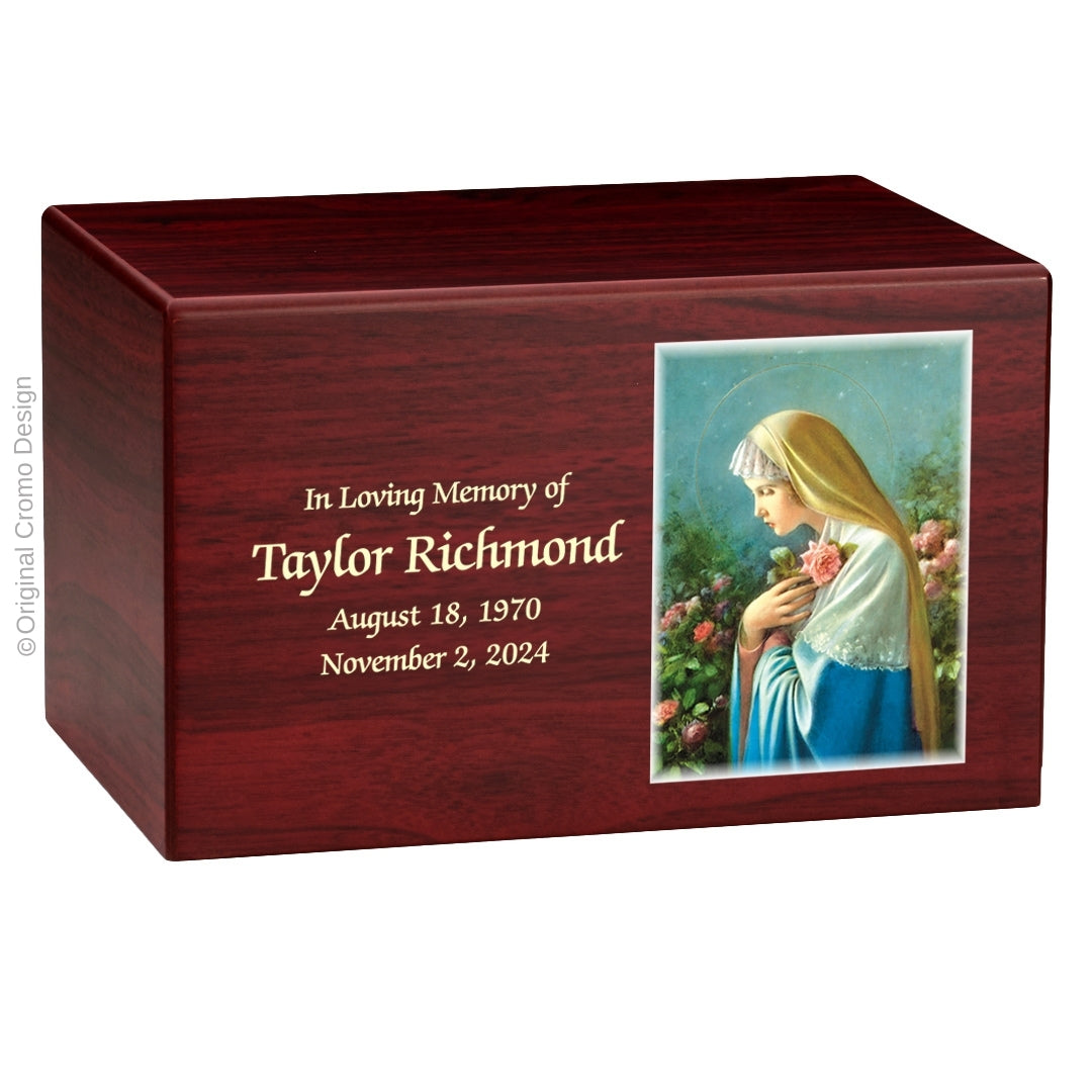 The Cromo MDF Urn is a beautifully crafted memorial, offering a timeless tribute to faith and remembrance. Measuring 5.5 inches in height, 9.1 inches in length, and 6.3 inches in width, this urn is made from durable Medium Density Fiberboard (MDF) and features an advanced UV-cured Texture printing process. This unique technique creates a raised, lifelike image that families can both see and feel, enhancing the beauty of their cherished memorial.