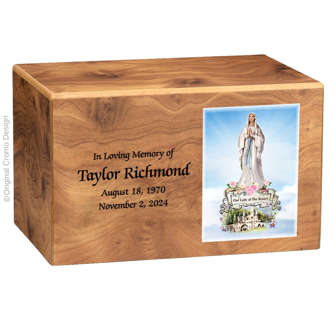 Designed with original Italian artwork from Cromo NB Studios in Milan, Italy, these urns blend classic artistry with deep Catholic devotion. Their sacred imagery resonates with the Catholic community, offering a meaningful reflection of faith and love. It includes up to 3 lines for personalization, allowing families to add a heartfelt touch to their loved one’s final resting place.