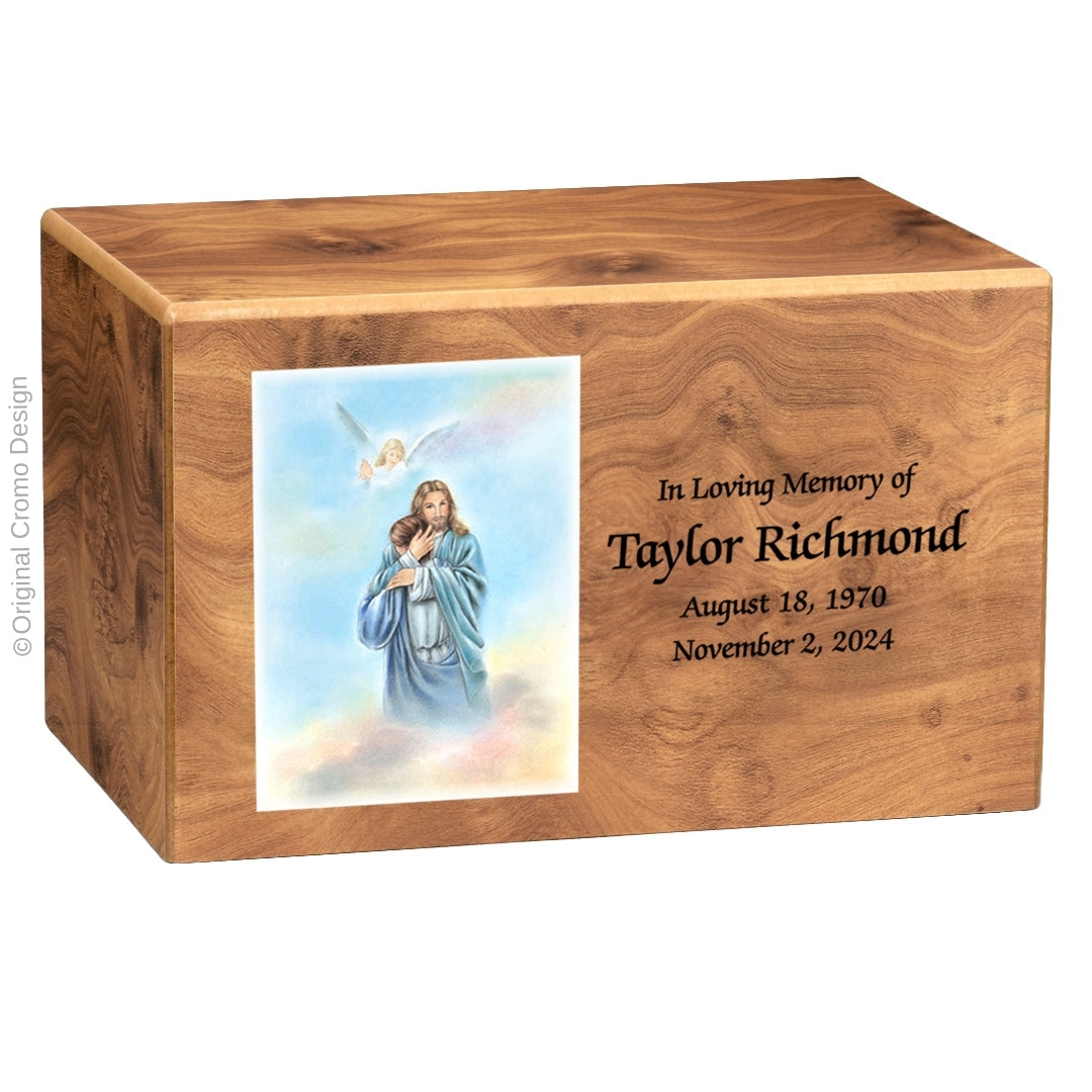 The Cromo MDF Urn is a beautifully crafted memorial, offering a timeless tribute to faith and remembrance. Measuring 5.5 inches in height, 9.1 inches in length, and 6.3 inches in width, this urn is made from durable Medium Density Fiberboard (MDF) and features an advanced UV-cured Texture printing process. This unique technique creates a raised, lifelike image that families can both see and feel, enhancing the beauty of their cherished memorial.